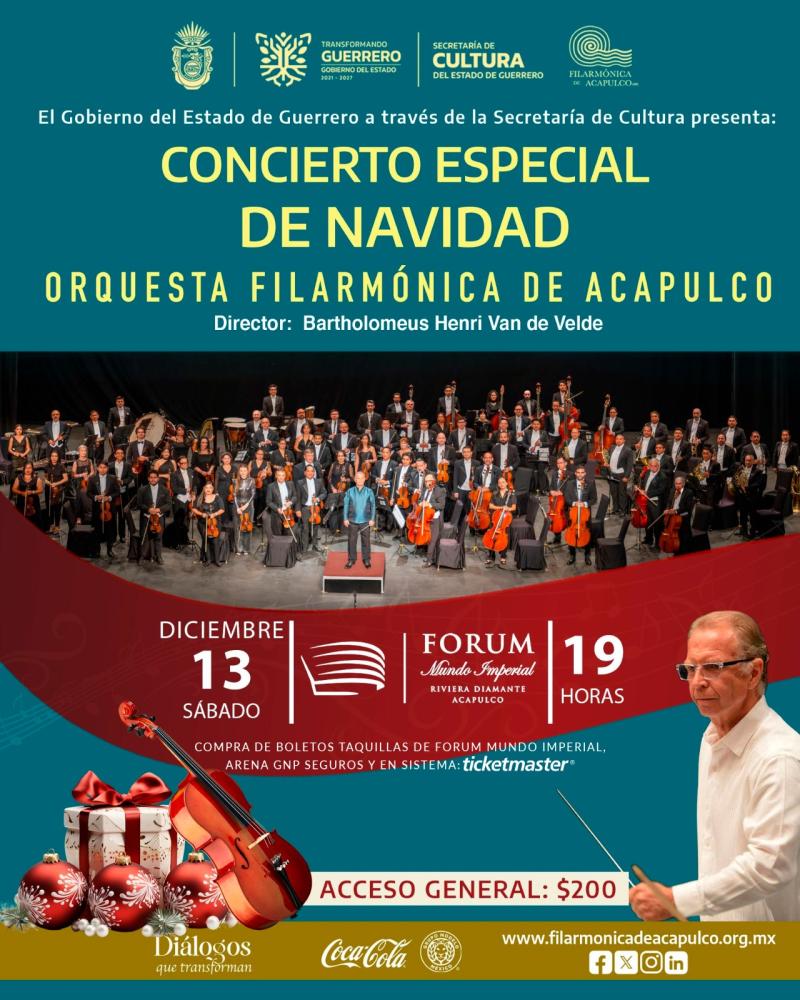 Este 13 de diciembre, deja que la Orquesta Filarmónica de Acapulco (OFA) —guiada por la batuta del extraordinario Bartholomeus-henri Van De Velde — te envuelva en una noche donde cada nota es un abrazo y cada melodía, un destello navideño. 🎄🎻