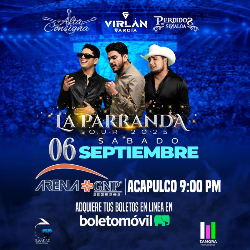 La Parranda Tour 2025 llega este sábado 6 de septiembre a Arena GNP Seguros con tres grandes del regional mexicano: Alta Consigna, Virlán García y Perdidos de Sinaloa.