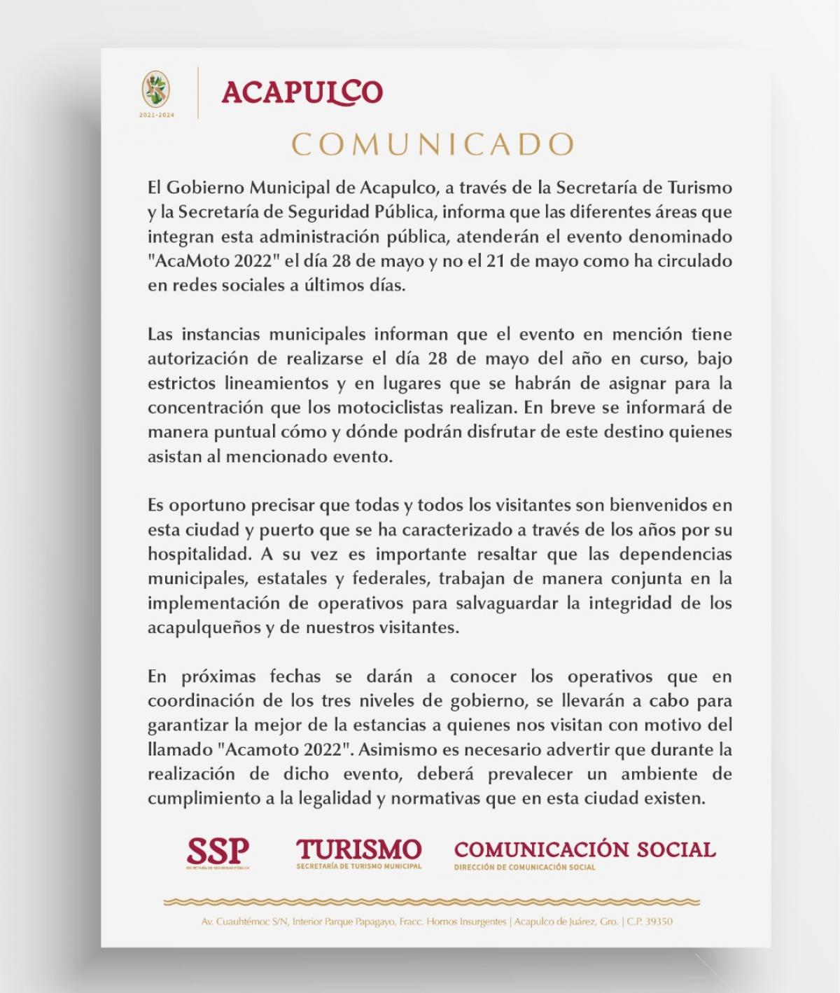 Aunque aún no se tiene un lugar asignado para este evento que reúne a cientos de motociclistas, las instancias municipales se han comprometido a darlas a conocer de manera puntual, dejando en claro que habrá operativos para resguardar la seguridad de los anfitriones como de los que disfrutan de este tipo de espectáculos, exhortando a los asistentes mantener el orden y la paz en el destino turístico.