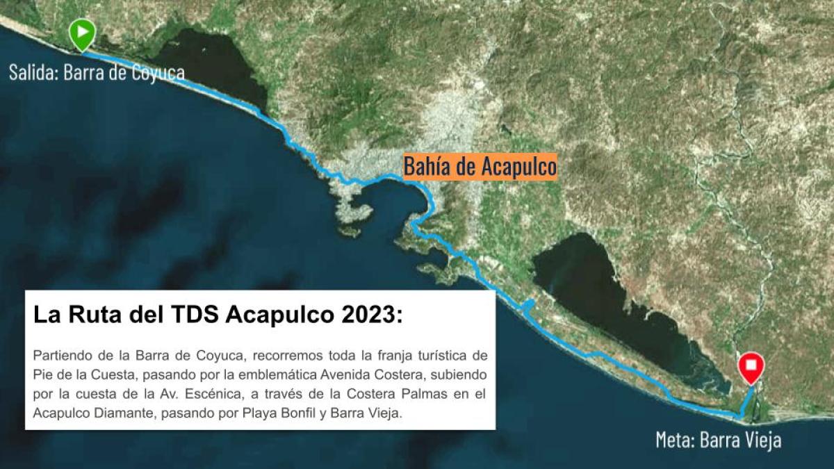 La ruta a recorrer Iniciará en Pie de la Cuesta hasta llegar a la Av. Costera Miguel Alemán para posteriormente cruzar la Av. Escénica, para así llegar al Boulevard de las Naciones, luego pasar Bonfil, Tres Vidas, y finalmente concluir la meta en Barra Vieja.