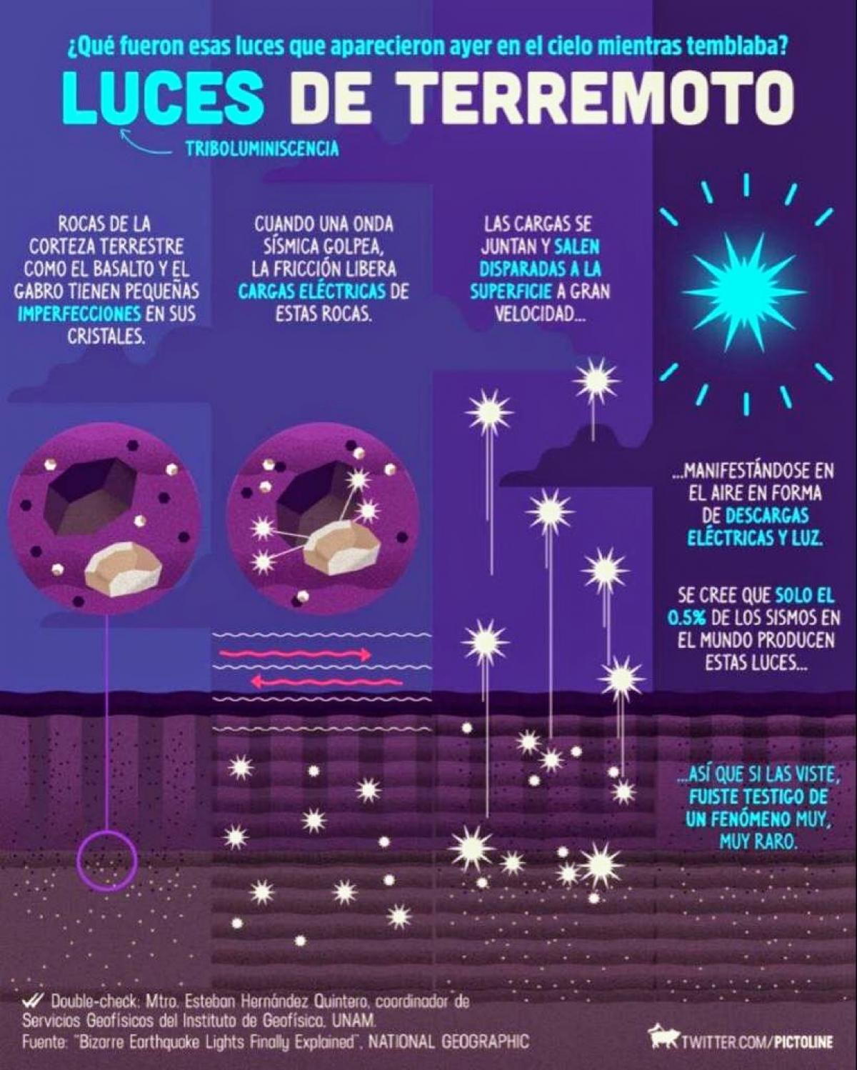 La razón de la presencia de estos destellos han sido revelado por el académico del Instituto de Geofísica de la UNAM Esteban Hernández en 2017 y se trata de un fenómeno conocido como triboluminicencia, resultado de la fricción entre rocas de la corteza terrestre que al ser sometidas a este efecto sueltan electrones o cargas eléctricas y son expulsadas a la atmósfera que al entrar en contacto, se producen luces que se pueden tornar en color dorado, blanco, azul o rojizo.