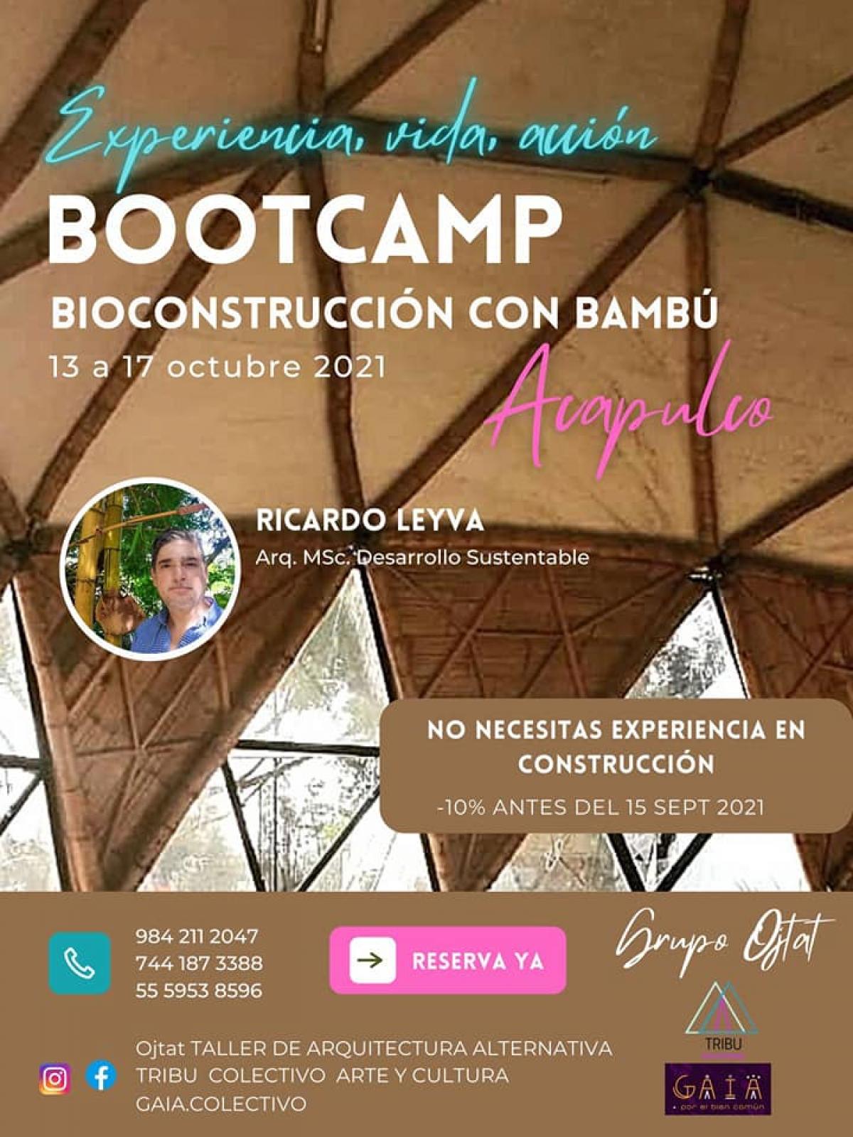 Se invita a mujeres y hombres a participar en el primer bootcamp de bioconstrucción con bambú que buscan desarrollar un estilo de vida auto sostenible durante los días 13, 14, 15, 16 y 17de agosto en Acapulco enfocado a la forma en cómo construimos los espacios que habitamos.