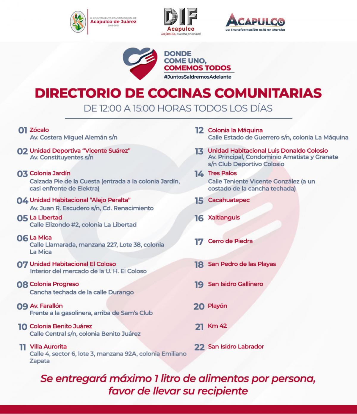 El ayuntamiento de Acapulco pone en marcha las cocinas comunitarias a partir del miércoles 22 de abril para mitigar los efectos de la pandemia por el Covid-19, implementando 22 espacios para que los acapulqueños que más lo necesita exhortado a la población llevar sus recipientes y puedan llevar alimento a sus familias.