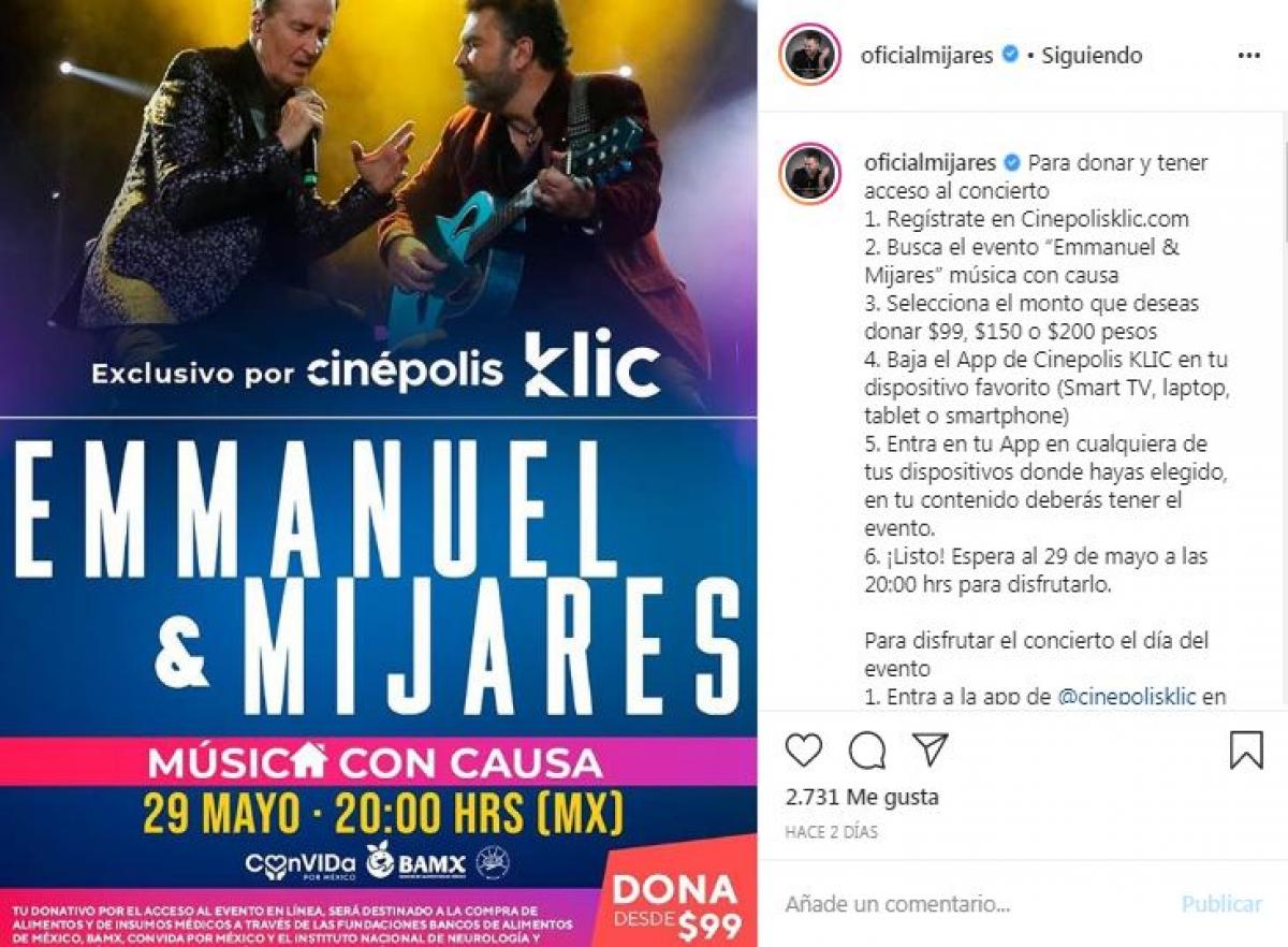 Los cantantes Emmanuel y Mijares anuncian que el próximo 29 de mayo a las 20 hrs darán un concierto denominado “Música con causa” con el propósito de recaudar fondos y destinarlos al sector salud transformados en alimentos e insumos médicos tales como guantes, cubrebocas entre otros materiales quirúrgicos de primera necesidad para mejorar el servicio médico, argumentando que estos “héroes sin capa” se enfrentan diariamente a la lucha contra el covid-19.