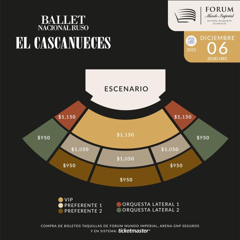 Este 6 de diciembre, déjate envolver por la elegancia, la música y la fantasía de El Cascanueces, interpretado por el prestigioso Ballet Nacional Ruso de Sergei Radchenko, en el majestuoso escenario de Forum Mundo Imperial. 🩰🎄