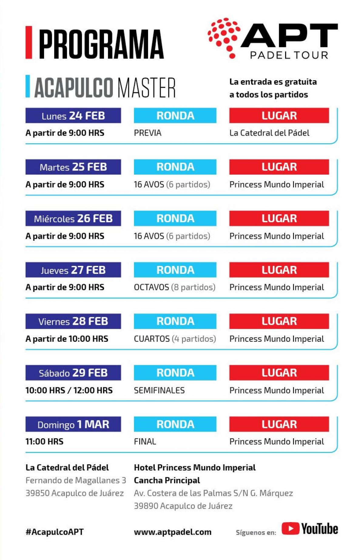 El 24 de febrero dio inicio el American Padel Tour 2020 en la zona Riviera diamante al mismo tiempo que el Abierto Mexicano de Tenis, sin embargo este concluirá el 1 de marzo y el Mextenis el 29 de febrero.