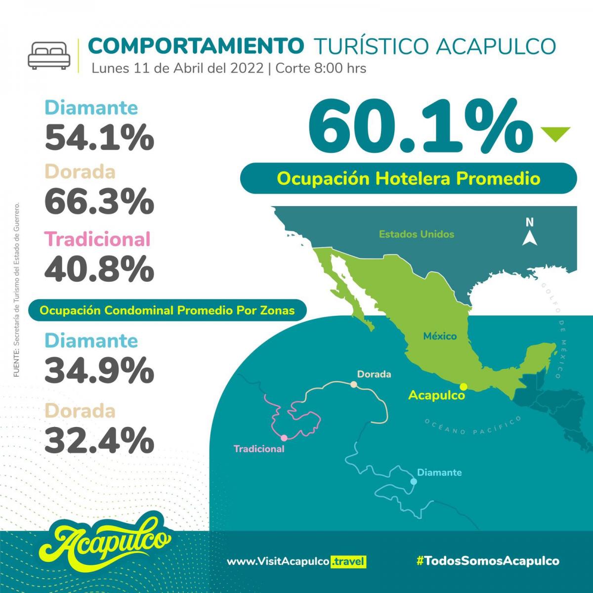 Con motivo de las festividades de domingo de ramo, semana santa, pascua y temporada vacacional, Acapulco registró este lunes una ocupación hotelera del 60.1 porcentual, de acuerdo a la Secretaría de turismo en la entidad, (SECTUR).