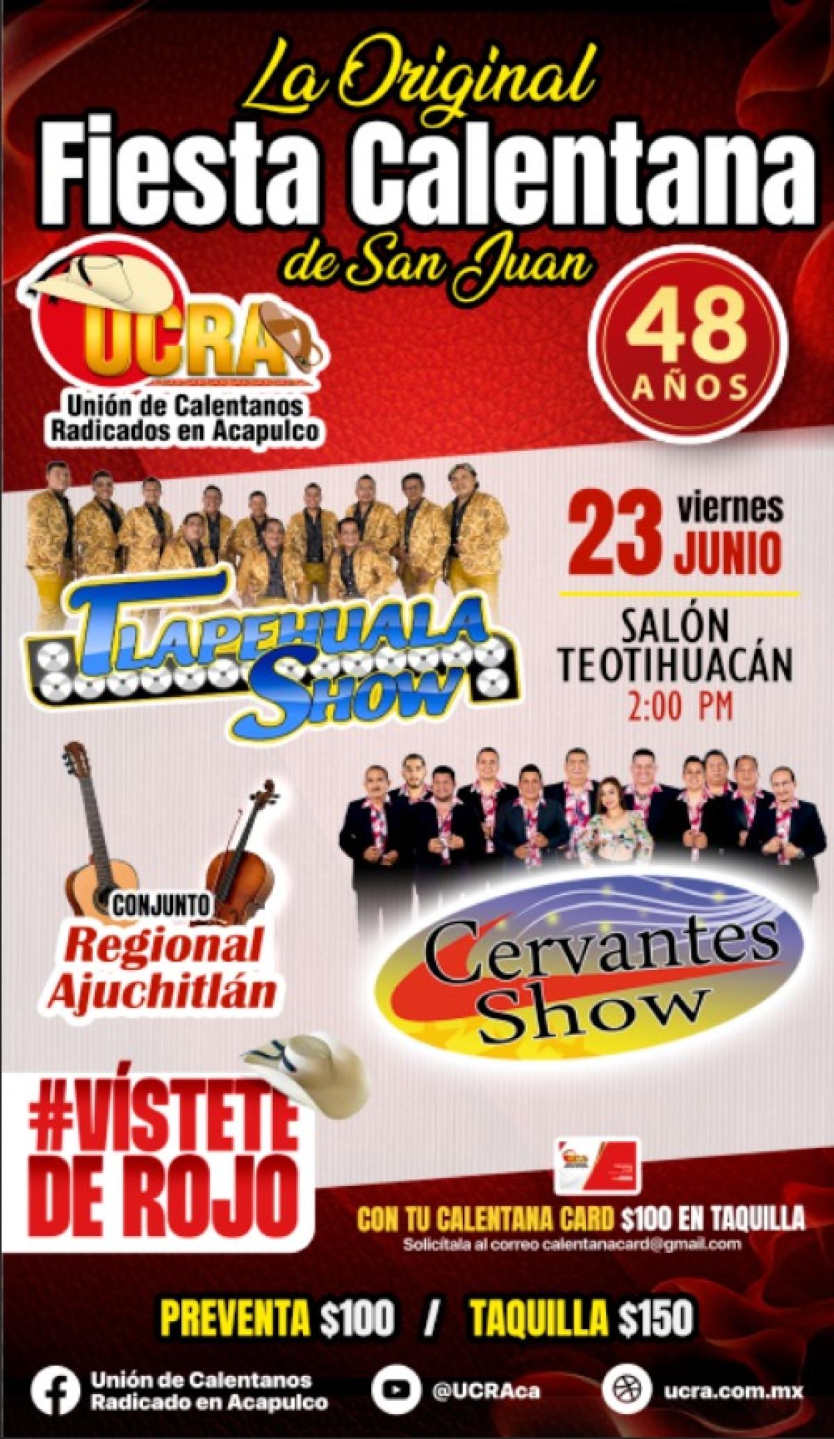 La Unión de Calentanos Radicados en Acapulco (UCRA) llega a Acapulco y nos trae dos días de pura fiesta para celebrar el "Día de San Juan" el próximo jueves 22 y viernes 23 de junio con una super cabalgata que comenzará el jueves 22 a las 4:00 de la tarde, partiendo desde el Asta Bandera hasta llegar a la plaza Marbella, justo en la Glorieta de La Diana.