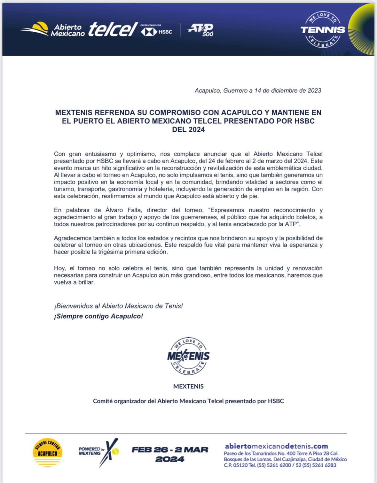 "El Abierto Mexicano no solo celebra el tenis, sino que también representa la unidad y renovación necesarias para construir un Acapulco aún más grandioso", afirmó Falla. El torneo se convierte así en un faro de esperanza, contribuyendo a la reconstrucción y al resurgimiento de la belleza de Acapulco, que, aunque afectado, está listo para brillar una vez más.