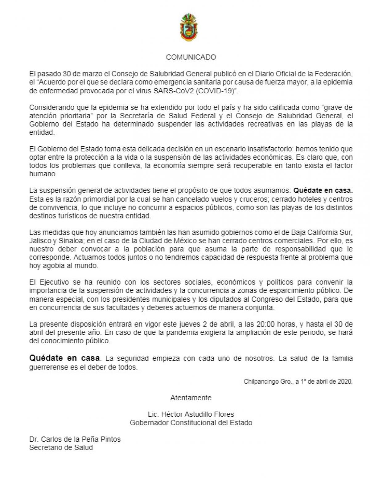 Héctor Astudillo Flores, gobernador de Guerrero, agregó la noche del miércoles 1 de abril, el anuncio de cancelación de vuelos, llegada de cruceros, el cierre de hoteles y espacios públicos, exhortando a la población tomar medidas preventivas y sanitarias para evitar la propagación de coronavirus además de promover la importancia de permanecer en casa durante la presencia de esta pandemia.