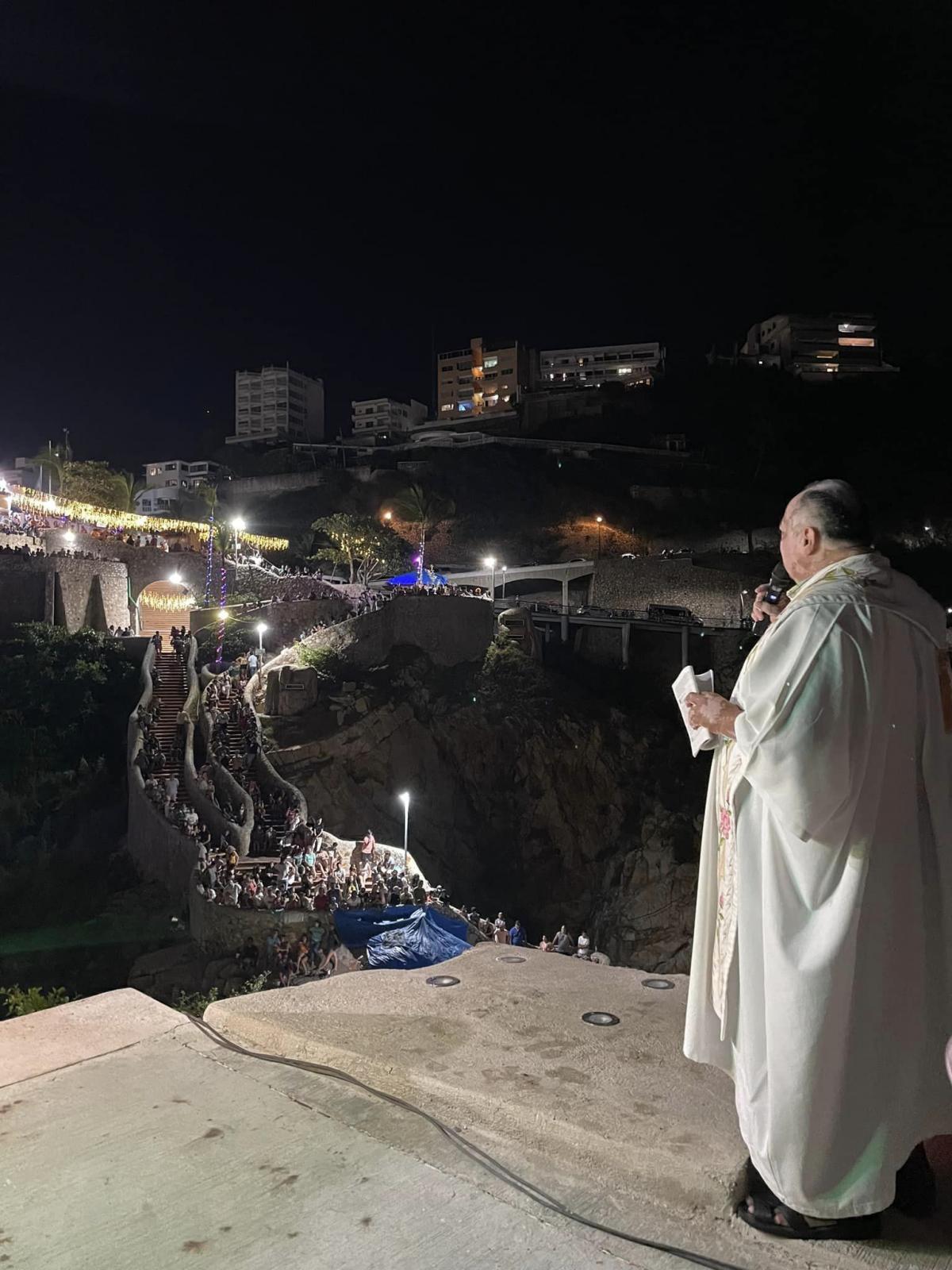 Luego de ofrecer un iluminado y conmemorativo show, los clavadistas escalaron el risco hasta su cima con antorchas en mano para celebrar la misa oficiada por el sacerdote Juan Carlos Flores Rivas y así concluir una noche de fiesta para sus agradecidos feligreses.