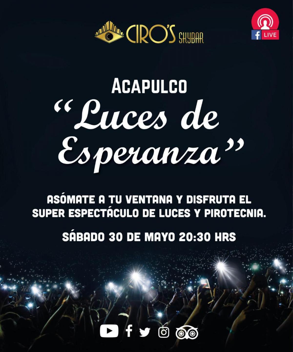 Empresarios de Acapulco se unen para enviar un mensaje de fe a todos los acapulqueños con un show de iluminación denominado “Luces de esperanza” que cubrirá con luces de colores la bahía de Santa Lucía y que se transmitirá en vivo a través de Facebook Live en la cuenta del restaurante Ciros Sky's Bar para aquellos que no puedan ver el show desde sus ventanas o azoteas.
