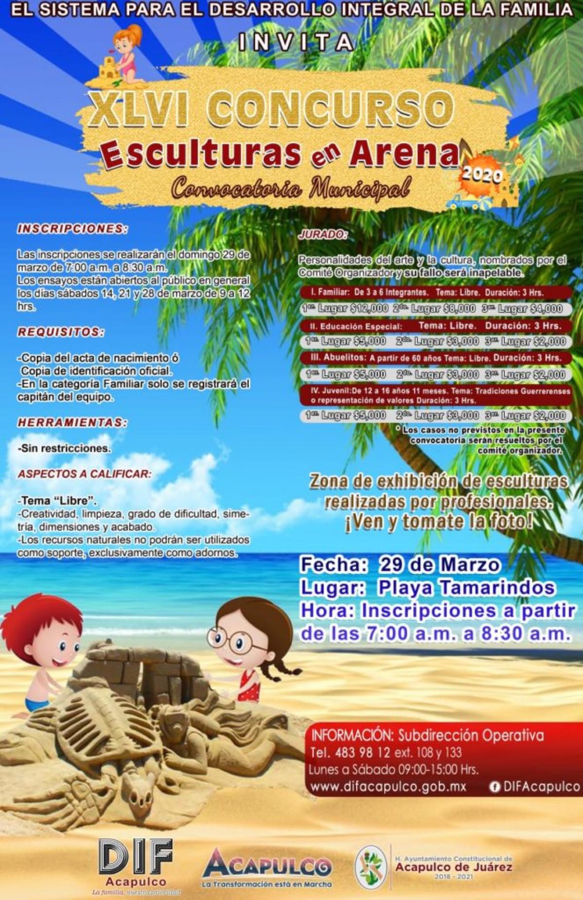 El próximo 29 de marzo se llevará a cabo la 46° edición de esculturas de arena 2020 en playa Tamarindos a partir de las 7 hrs que el DIF Acapulco en colaboración del gobierno municipal, realizan para celebrar la familia, promover el trabajo en equipo, la inclusión y el desarrollo integral de la ciudadanía acapulqueña.