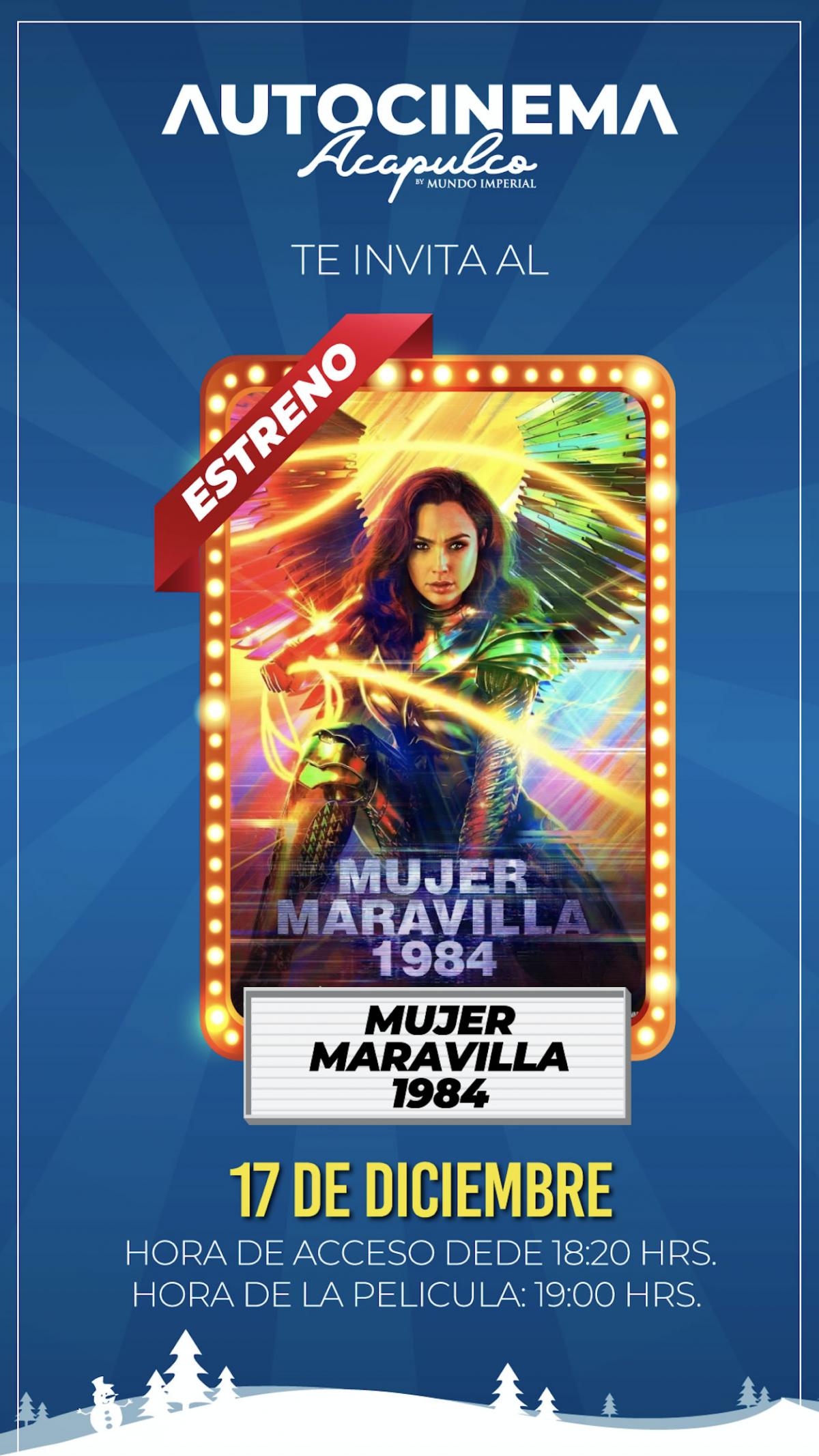 Autocinema Acapulco by Mundo Imperial presenta su cartelera para este fin de semana con películas que te harán pasar un momento de sano esparcimiento, entretenimiento y diversión desde la comodidad de tu auto, a un precio especial y para que no te pierdas el estreno de " Mujer maravilla 1984".
