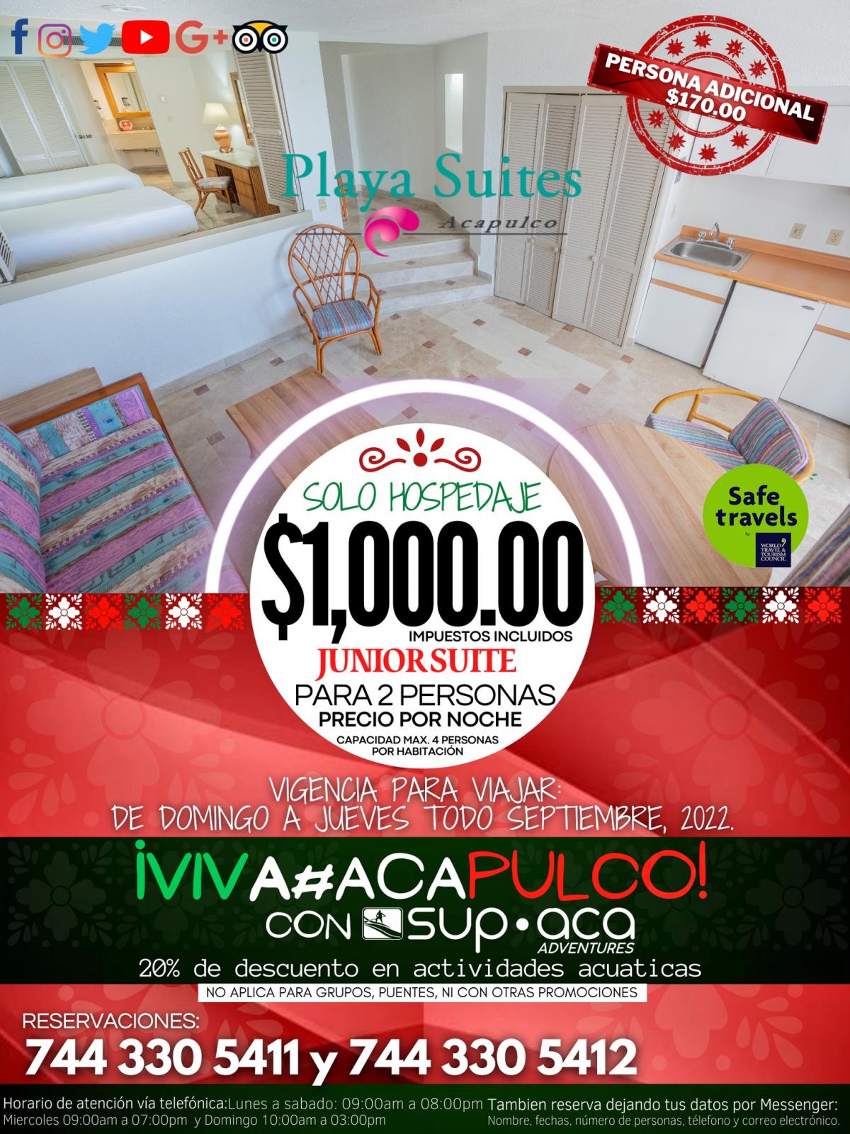 Si vives o visitas Acapulco durante las fiestas patrias o estas pensando arribar a este paradisiaco puerto en el puente de fin de semana, entonces aquí tienes una opción muy especial para disfrutar de Acapulco y sus playas con las promociones que nuestros amigos de Hotel Playa Suites y Sup Aca adventure tienen para ti.