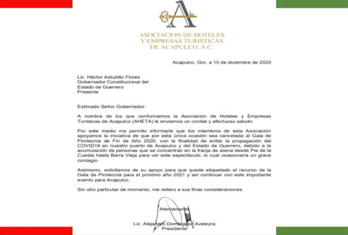 En conferencia virtual el gobernador de Guerrero Héctor Astudillo Flores confirma la cancelación de la gala de fuegos artificiales para recibir el año nuevo 2021 con motivo a la presente contingencia sanitaria que se vive mundialmente y con la intención de prevenir contagios de covid tanto en la población residente como en el turismo que visita los diferentes destinos de estado.