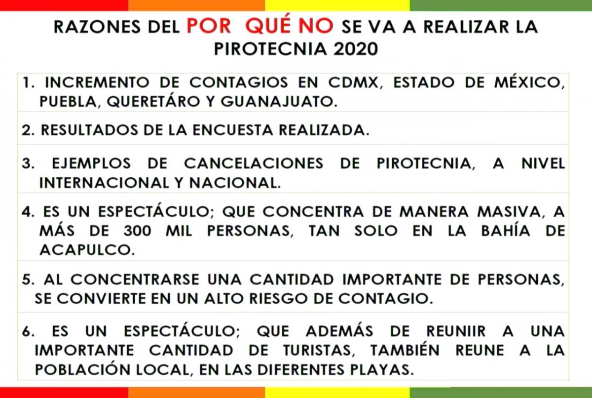 Asegura que no habrá pirotecnia institucional ni particulares a nivel mundial por lo que Guerrero se sumará como parte del ejemplo. Aunado a ello; Astudillo Flores hizo mención a los resultados obtenidos por una encuesta realizada a la población acapulqueña, misma que indica que el 68% estuvo a favor que el evento de pirotecnia se cancelara y con base a ello se tomó la decisión.