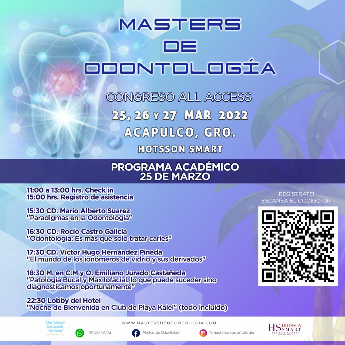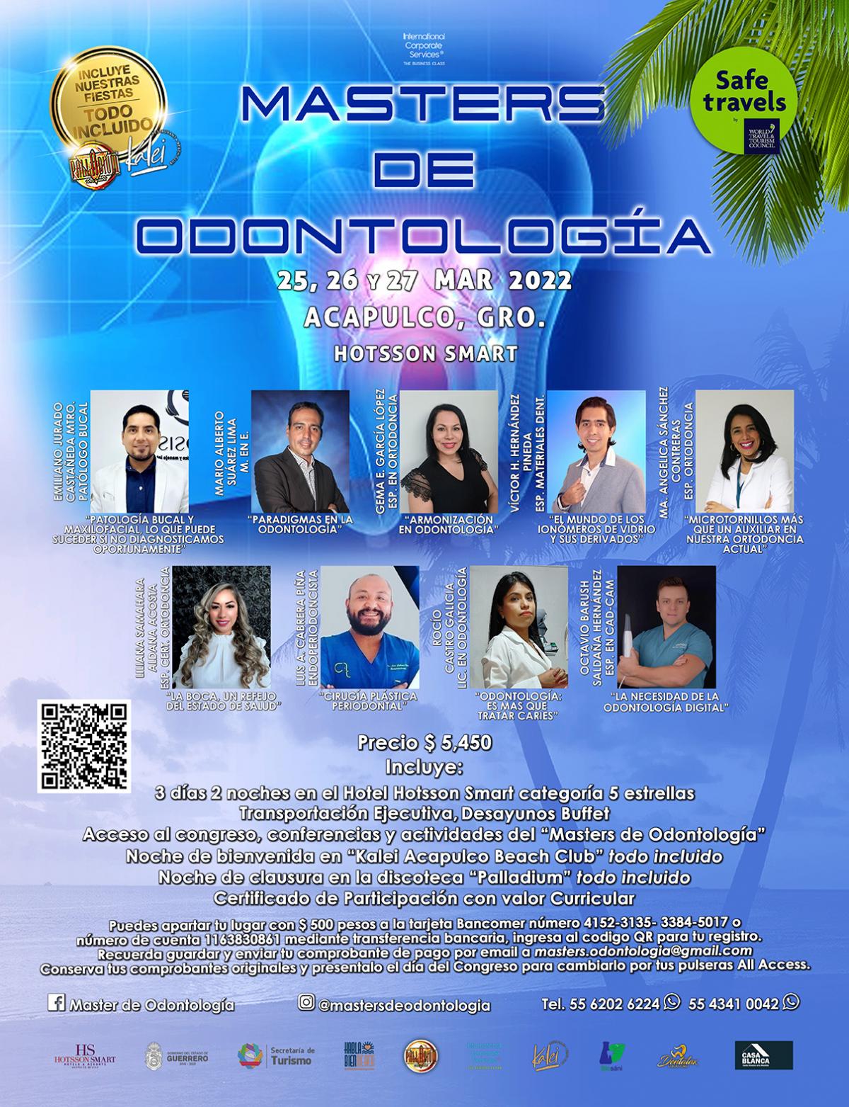 Del 25 al 27 de marzo del 2022 se llevará acabó el Magno Evento Masters de Odontología en Hotel Hotsson Smart Acapulco en el cuál se tratarán temas de innovación además de vivir la mejor experiencia Odontológica.
