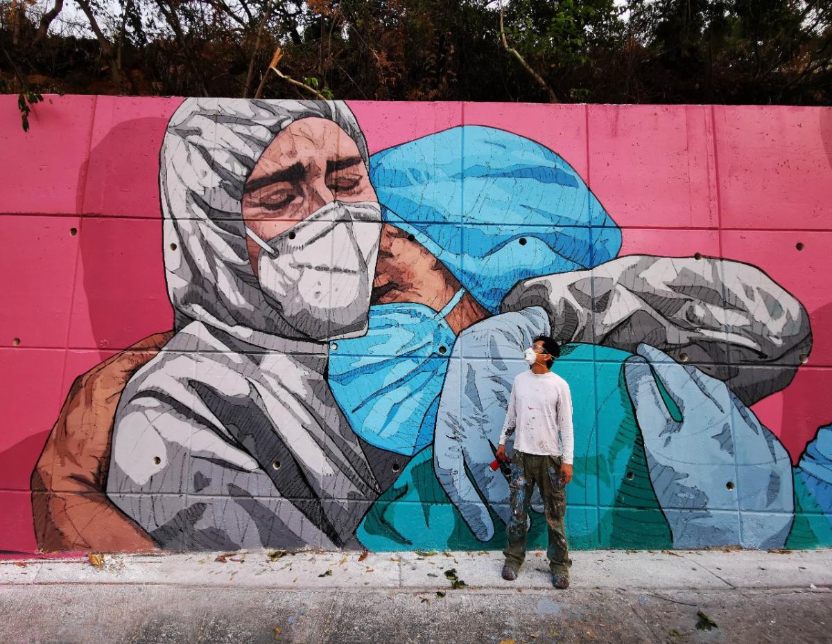 El artista David de León explica que en el mural quiso reflejar la preocupación, cansancio, miedo e incertidumbre de estos héroes por la labor y servicio que hacen todos los días en los centros de salud.