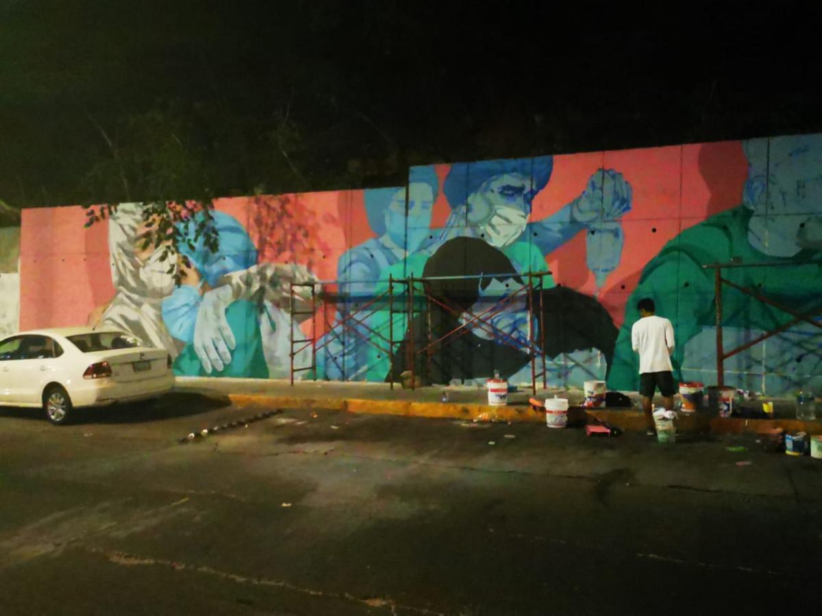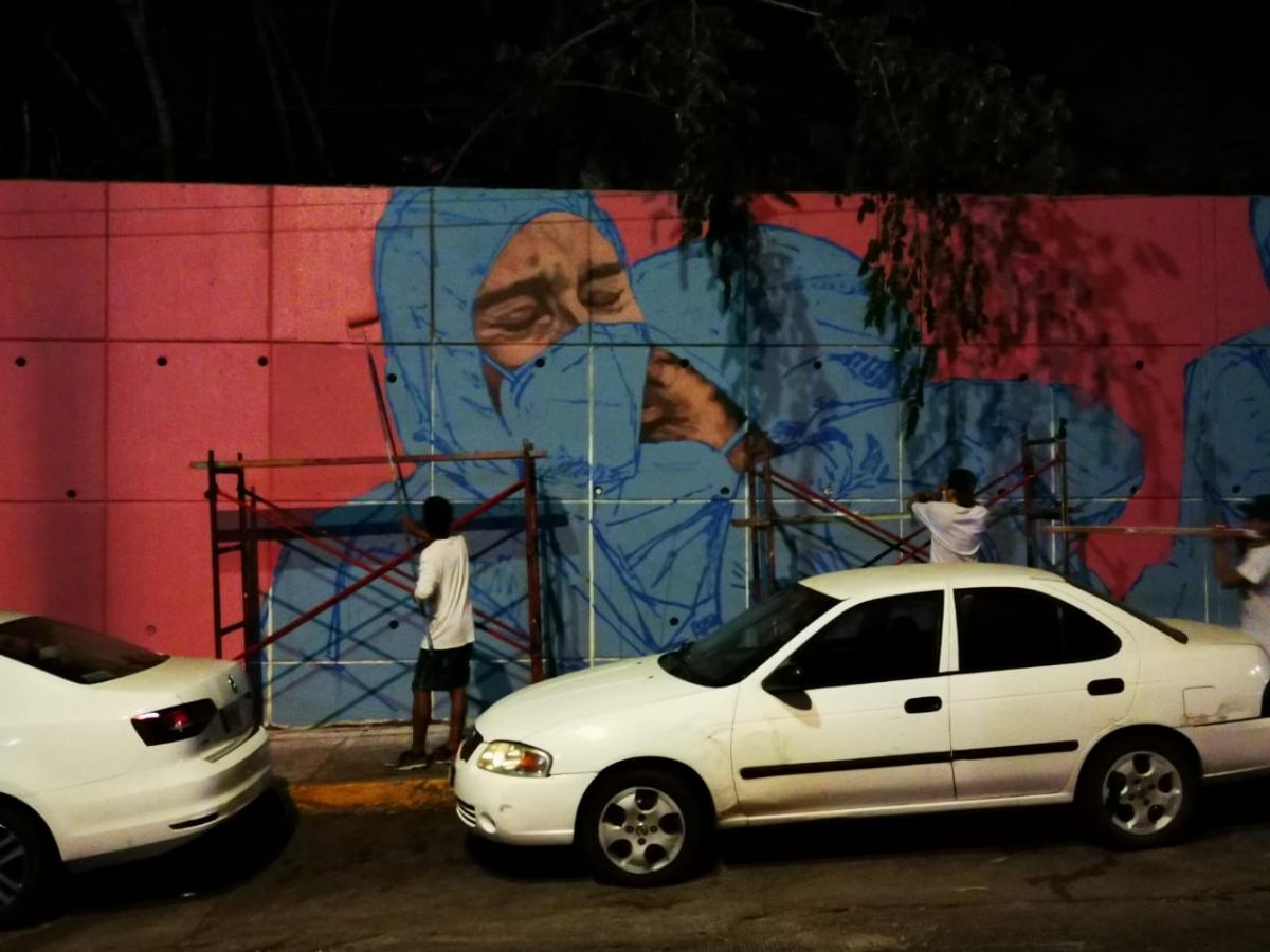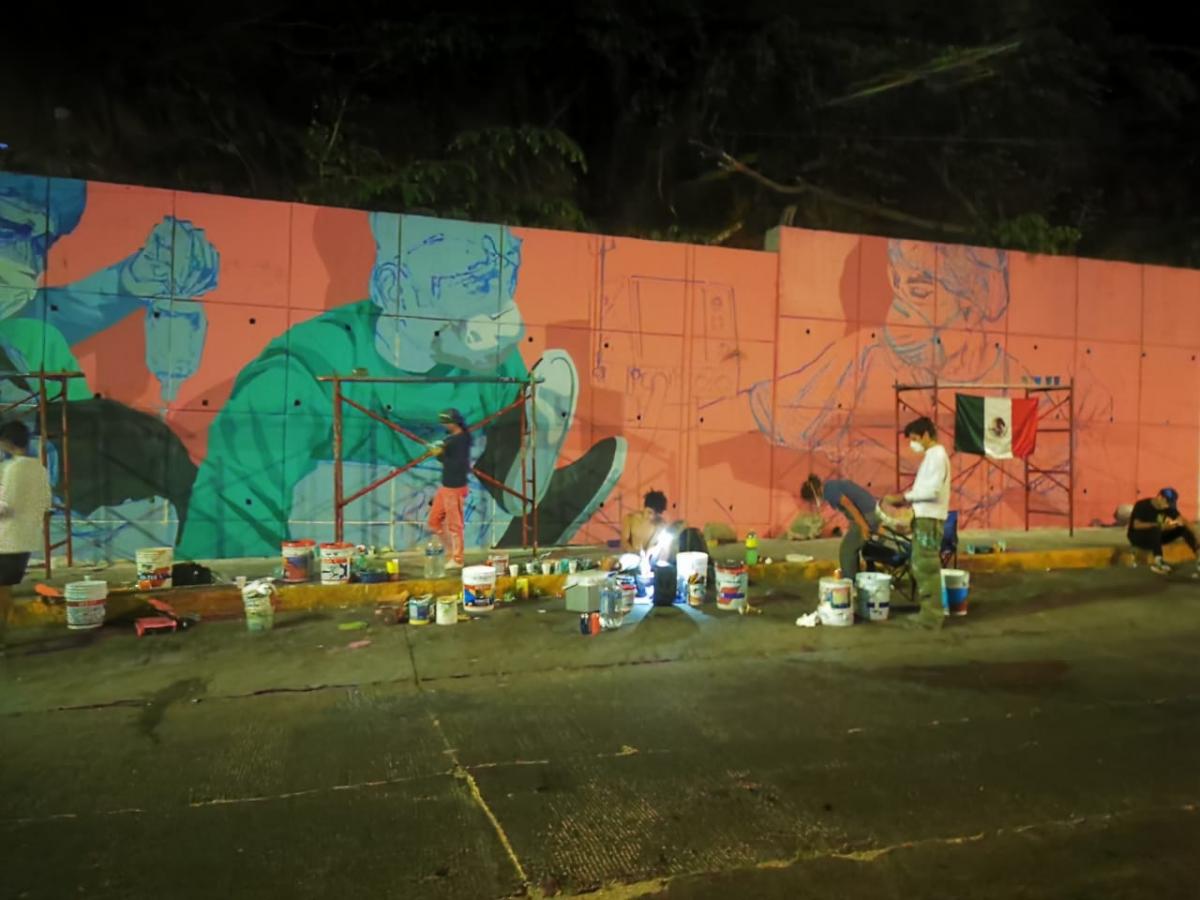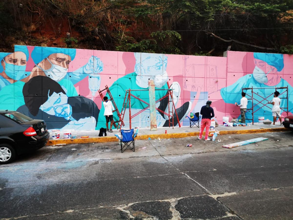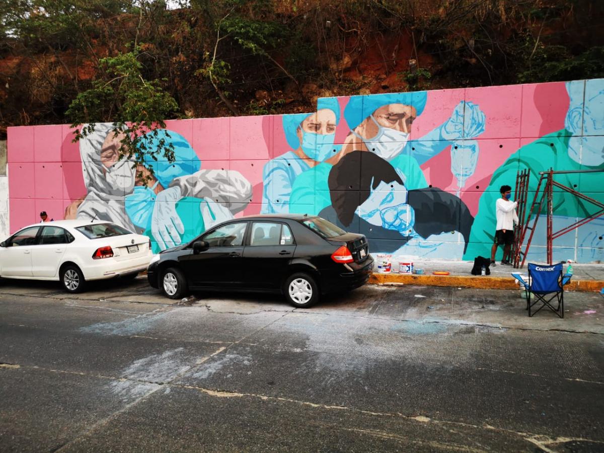 Muralistas de Acapulco rinden homenaje al personal de salud mexicano.