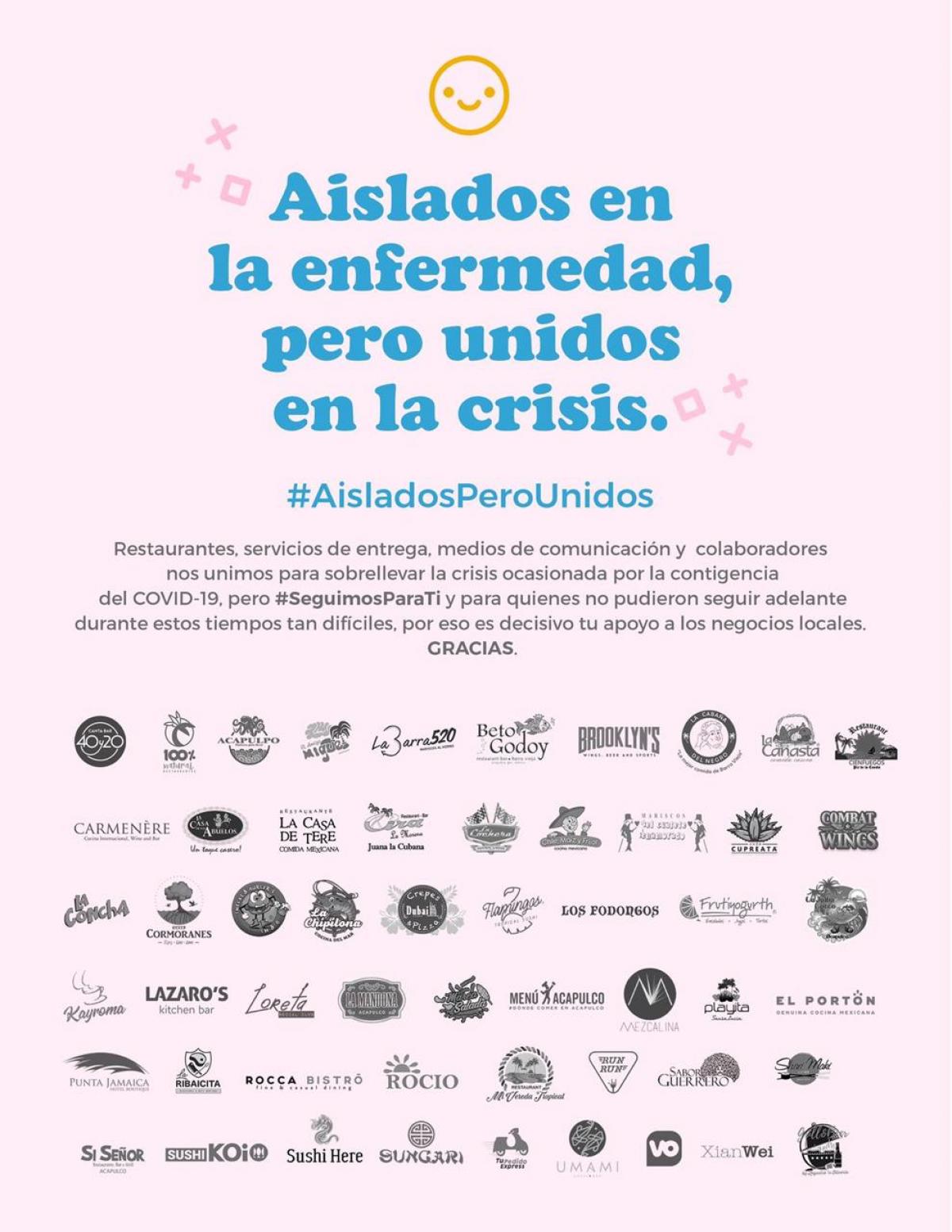 Pequeñas y medianas empresas se unen ante la iniciativa convocada por Menú Acapulco bajo el slogan #AisladosPeroUnidos para apoyar al sector restaurantero haciendo frente a la llegada del covid-19 al puerto promoviendo el consumo local de servicios, productos, alimentos que permitan la circulación de la economía ante la crisis viral que se está viviendo.