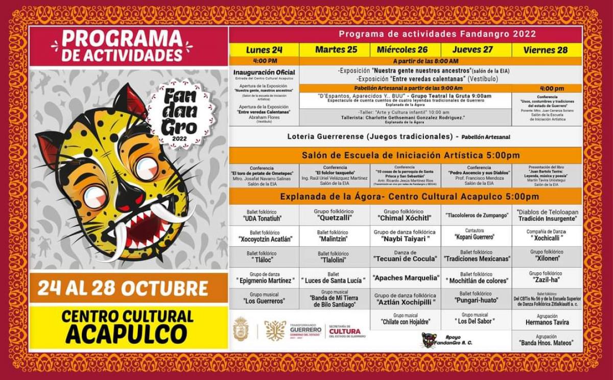A partir del 24 al 28 de octubre, Acapulco se llena de color con el festival FandanGro 2022 en el que se desarrollarán una serie de actividades que exponen la cultura, costumbres y tradiciones del estado de Guerrero que tendrán sede en diversas sedes del puerto para el disfrute de la ciudadanía y público en general.