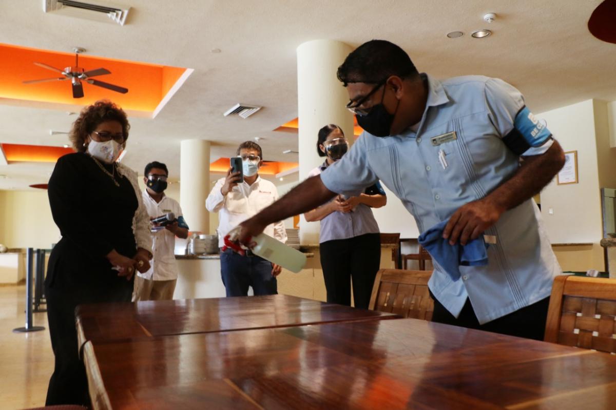 La alcaldesa constató las acciones de reforzamiento que se instrumentaron en el restaurante Bella Vista del hotel Las Brisas, siendo recibida con un filtro sanitario donde le tomaron la temperatura, pasó un tapete desinfectante de calzado y le aplicaron gel antibacterial en las manos, para poder acceder a la terraza donde el mobiliario estaba debidamente desinfectado y las mesas separadas a más de un metro y medio de distancia.