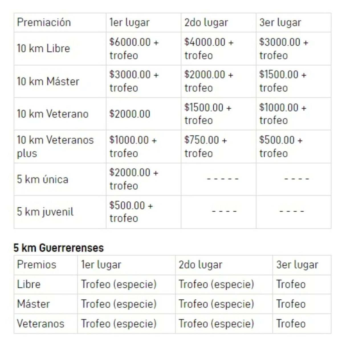 Habrá premios en efectivo para los tres primeros lugares en las ramas libre, máster, veteranos y veteranos plus a excepción de quienes corran 5 km, sólo se premiará al primer lugar y se les otorgará trofeo a todos los ganadores.