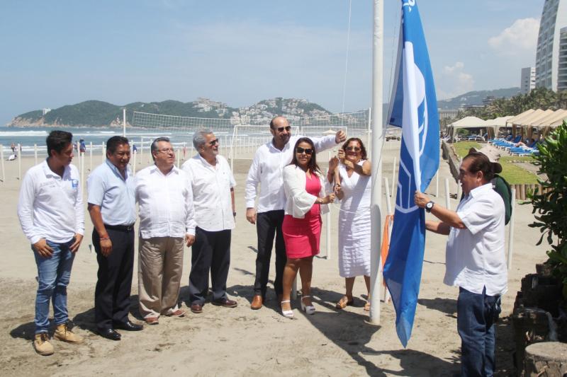Funcionarios del gobierno municipal y representantes de la sociedad civil organizada, izan el distintivo internacional Blue Flag en dos tramos de la playa Revolcadero, galardón ambiental reconocido en el mundo, que posiciona al puerto como un destino turístico sustentable.