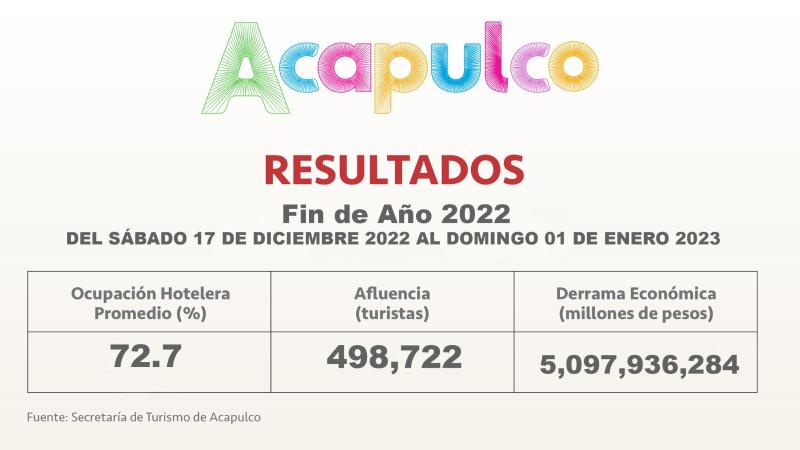 La Secretaría de Turismo en la entidad (Sectur), anunció el domingo de la primer semana de enero del año en curso, los resultados registrados durante el periodo vacacional que comprende del 17 de diciembre de 2022 al 8 de enero de 2023; dando a conocer que la cifra lograda en derrama económica fue de 7 mil 691 millones de pesos y un total de 977 mil turistas que se hospedaron en la franja hotelera del puerto.