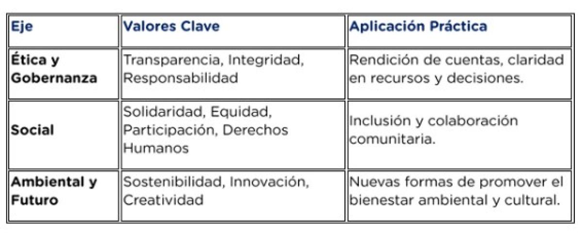 Los valores se agrupan en ejes temáticos para facilitar su comunicación, aplicación de proyectos y reportes de impacto. Esta estructura promueve una gobernanza ética inclusión social y visión de un futuro sostenible ética y gobernanza, transparencia, integridad responsabilidad.